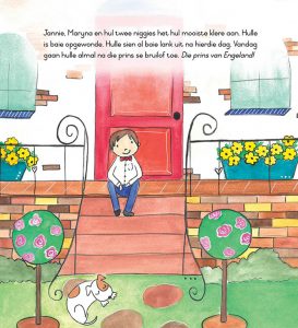 Jannie, Maryna en hul ouboet kuier saam met Pappa en Mamma by hul niggies in Engeland. Hulle gaan almal saam na die prins se bruilof toe. Maryna mors egter haar wit rokkie vuil omdat sy ongehoorsaam is. Haar rokkie is vuil en sy word gestraf vir haar ongehoorsaamheid. Gelukkig daag haar ouboet op en bied aan om haar straf namens haar te dra. Hy sorg dat sy ’n nuwe wit rokkie kry sodat sy die bruilof van die prins kan bywoon. Hierdie verhaal bied die kern van die evangelieboodskap uit en stel klein kindertjies in staat om Christus se plaasbekledende offer te verstaan. Amazon skakel: https://amzn.to/3rDBZCE