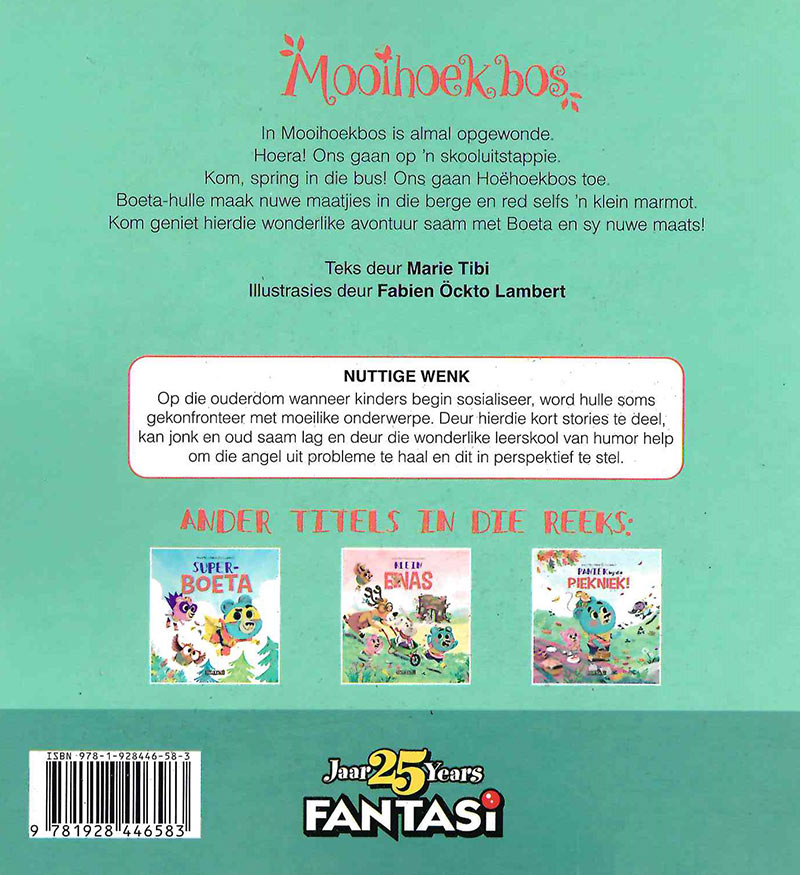 In Mooihoekbos is almal opgewonde. Hoera! Ons gaan op ‘n skooluitstappie. Kom, spring in die bus! Ons gaan Hoehoekbos toe. Boeta-hulle maak nuwe maatjies in die berge en red selfs ‘n klein marmot. Kom geniet hierdie wonderlike avontuur saam met Boeta en sy nuwe maats! Deur Marie Tibi, Fabien Ockto Lambert